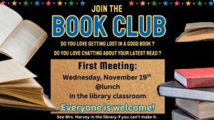 Our first meeting will be held on Wednesday, November 19th @ lunch in the library classroom. If you can’t make this meeting, please come see Mrs. Harvey in the library anytime.