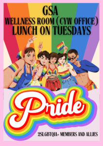 The GSA is the Gender and Sexuality Awareness group, also known as the Gay Straight Alliance. It is a safe space for the LGBTQ2S+ community, and allies, to connect, support each other, and just have a good time! LGBTQ+ stands for lesbian, gay, bisexual, transgender, queer or questioning, and Two Spirit. We will meet every Tuesday at lunch (from 10:50 – 11:50) in the Wellness Room(Corridor 5 near the CYW office). All students are always welcome!